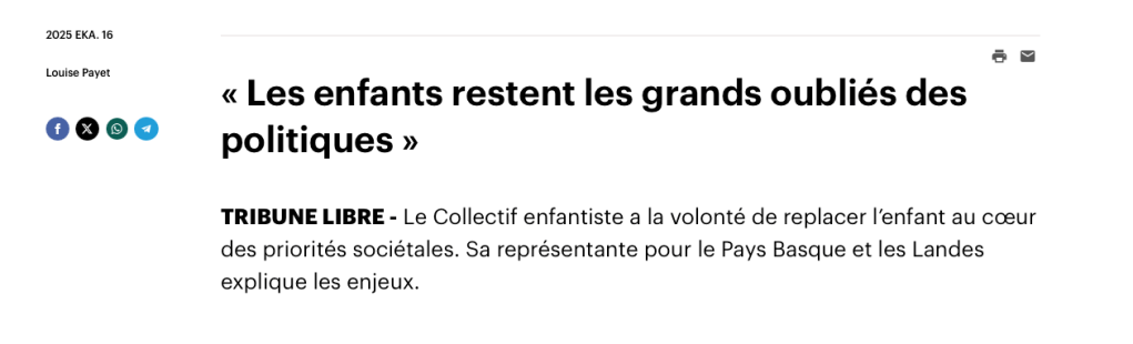 Le Collectif enfantiste, né de la volonté de replacer l’enfant au cœur des priorités sociétales, alerte depuis plusieurs années sur cette problématique. À travers ses actions au Pays Basque et dans toute la France, notre collectif porte la vision d’une société respectueuse des droits, des émotions et du développement des plus jeunes. Nous aspirons à une société qui écoute, qui accompagne, qui protège.