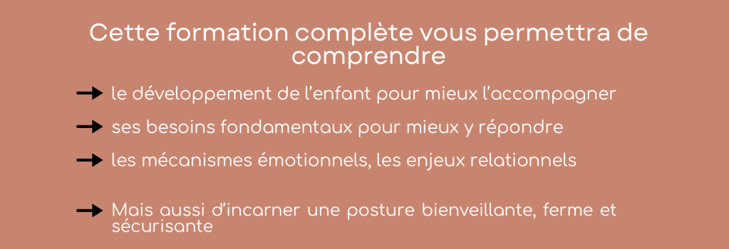 - Comprendre les principes fondamentaux : connaître les grandes bases du développement de l’enfant pour mieux l’accompagner, explorer les concepts clés de l’éducation bienveillante tels que l’empathie, la communication non-violente, l’éducation non genrée, l’accueil et l’accompagnement des émotions, etc…